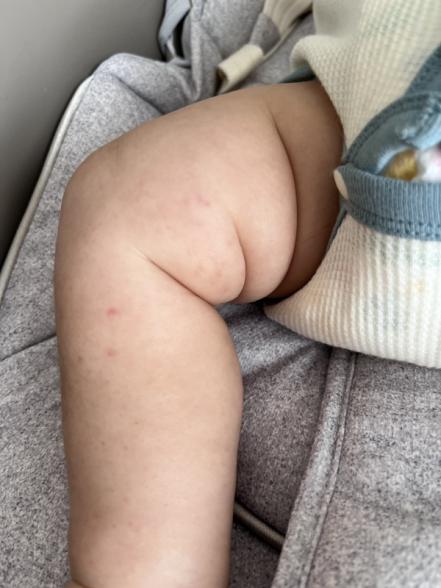 例えば、移動中に抱っこ紐で圧迫されていた可能性があったりすることもありますよ。お子さんのご様子がお変わりないということですし、1週間後に予防接種があるということでしたら、その際にご相談いただければと思います。一時的な症状でしたら、ご様子を見ていただいていいように思いますが、もし何日も消失しなかったり、誘因となるようなエピソードがないのに、増えてくるようでしたら、早めに小児科でご相談くださいね。