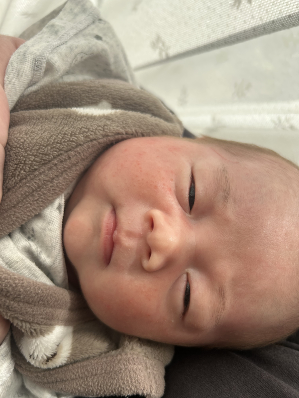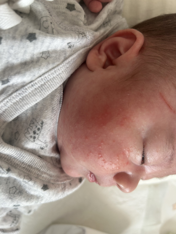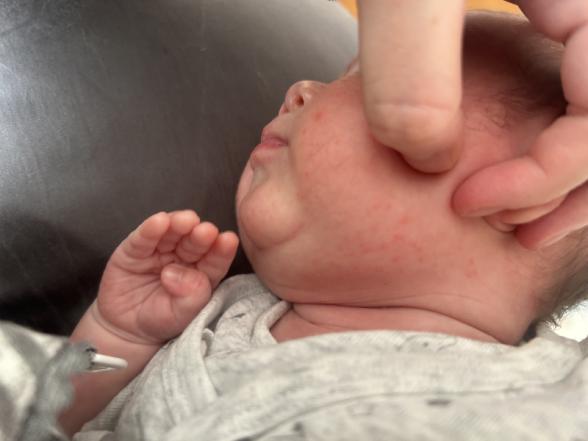 2/27には片頬に一つ二つしかなかった発疹が、ここ数日で増えていき、両頬に広がり、フェイスラインにも発疹ができています。3/25にお宮参りを控えている為、できる限り治してあげたいです。受診レベルなのか、受診すれば薬を処方してもらえるのか教えていただきたいです。また、もともとアトピタクリームとベビーオイルを使っていましたが、顔だけアロベビーに変えてみました。保湿はこれでいいのでしょうか。