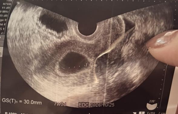 先日妊娠が分かり、最終月経日から数えて6w5dの今日産婦人科を受診しました。エコーを見てもらい胎嚢が30.0mmと7w3dに相当する大きさでしたが心拍は確認できないので2週間後に改めてきてくださいと言われました。先生には排卵がズレている可能性もあるから!と言われましたがズレていたとしてもタイミングを取ったのが1.2回しかなくそのどちらかになるので2.3日くらいしかズレていないと思います。こちらのエコー写真には赤ちゃんがいるようなものは写ってはいないでしょうか?(卵黄嚢など)胎嚢だけ大きく何も見えないのは不安です。また、胎嚢の他に左右にも袋が見えます。特に先生からは指摘はありませんが気になりました。