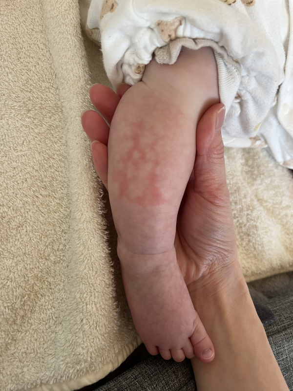 現在生後3ヶ月の女の子です。先程気づきましたが、脚に斑点?のような赤みが現れました。おそらく昨日まではなかったかと思います、、。