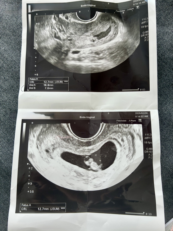 妊娠7週です。先日の健診で子宮内に出血があると言われました。赤ちゃんは順調に育っており、心拍確認もできました。特に安静制限も言われず薬も処方されず、1週間後に予定日と母子手帳の手続きするねといわれました。茶色の出血がでるかもしれないねと言われていますが、今のところ腹痛や出血なく経過しています。絨毛膜下血腫でしょうか?安静にとも言われていませんが、普通に生活していいのでしょうか?上が血腫で下が赤ちゃんです。