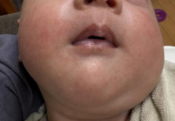 お写真からですと、なかなかはっきりとしたことは明言できませんが、しばらく続けていただいても、なかなか改善しない場合や酷くなったり、広がってきたりするようでしたら、健診や予防接種の際でも構いませんので、一度ご相談なさってみると安心かもしれませんね。