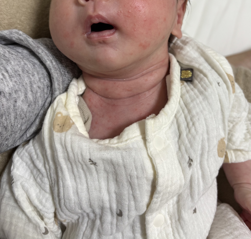生後12日頃から、首や顔周り、お尻あたりに湿疹が出始めてきました。