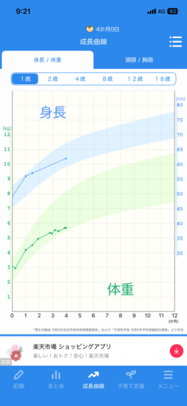 発育曲線の画像を添付しましたので、見ていただければと思いますが、出生時の身長が49.0、体重が3082gで昨日の3〜4ヶ月健診での身長62.0、体重5700gでした。医師からは本人なりに成長しているから心配しなくて大丈夫。本人の訴えがないなら、時間で授乳してみてとアドバイスいただきました。