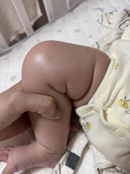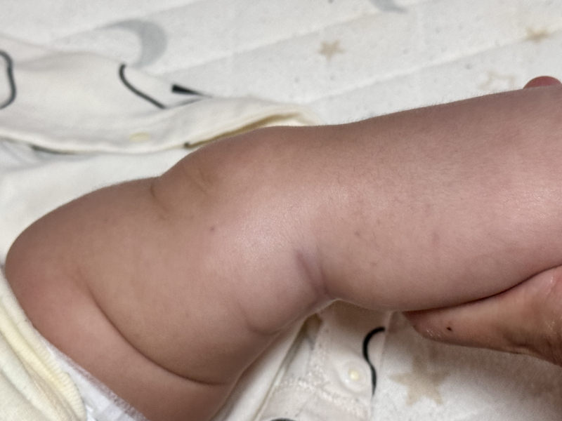 生後6ヶ月の両膝の裏の外側に写真のような薄いホクロみたいな薄紫色の点々があります。両方にあります。押しても消えません。