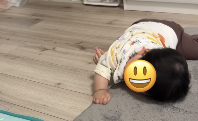 今は寝返りとずり這いしかできず、腰の座りやつかまり立ち、ハイハイはまだできません。
