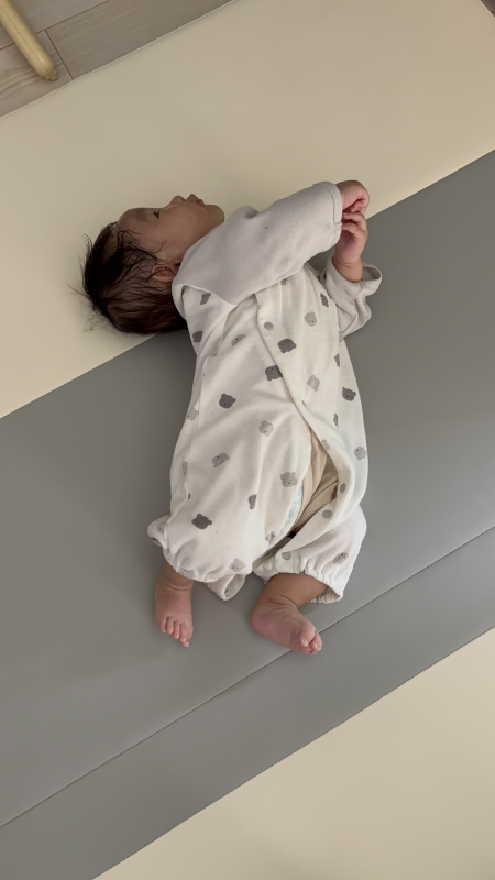 そのようにしていただくことで本来の寝返りの体制が取れるようになってきます。そうしてうつ伏せになってくれたら、うつ伏せ遊びをする時間を長くしてみてください。