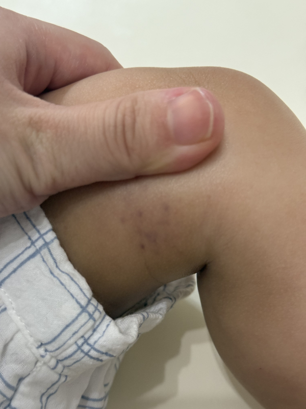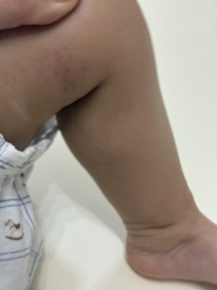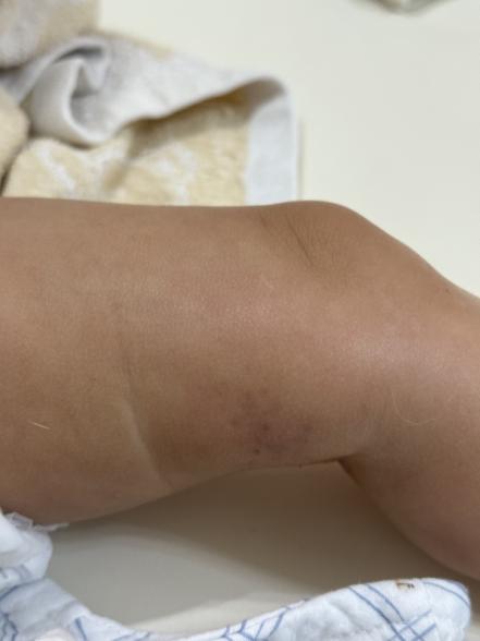 今日お風呂に入れた後、保湿をしていたら足の膝上内腿あたりに、黒い斑点があることに気がつきました.