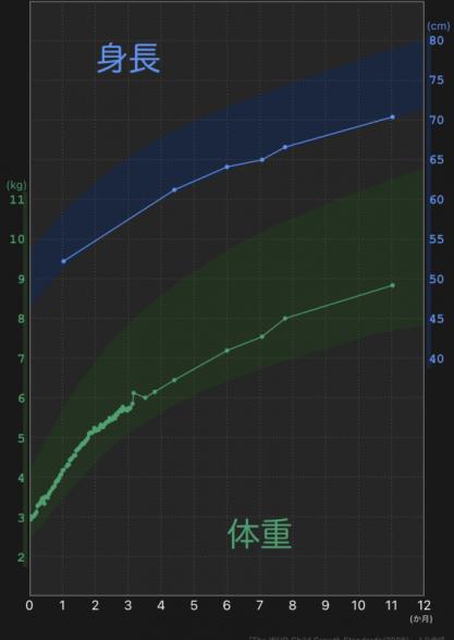 現状においては、身長も体重も成長曲線のカーブに沿って順調に伸びていますね。 これから歩きまわったり、走り出したり、急激に消費エネルギーが増す時期でもありますし、1歳過ぎの乳製品の必要量を考えても、エネルギー・カルシウム補給の為にもミルク量は最低でも300~400ml程度で維持されていくと良いのではないかなと思います。