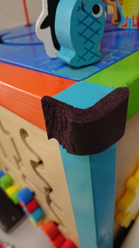 今日、おもちゃの角にコーナーガードが貼ってあるんですが、私がトイレに行っている間に食べていました。