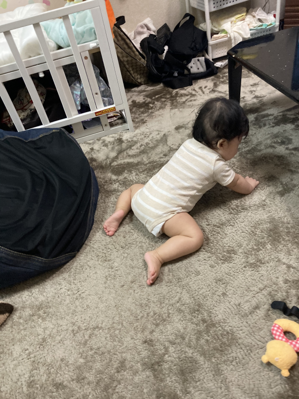 寝返りもズリバイもしますし、ハイハイまでは行きませんが、おしりは行きます。