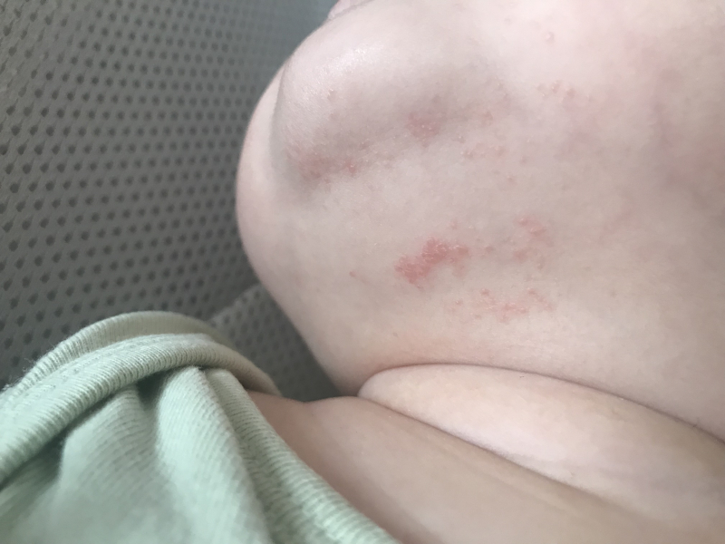 1〜2週間前から、あごの下、口元、首元、腕の関節部分に、赤いぽつぽつができました。特にあごの下に、濃い湿疹ができています。汗が原因かと思い、なるべく清潔を心がけているつもりでした。