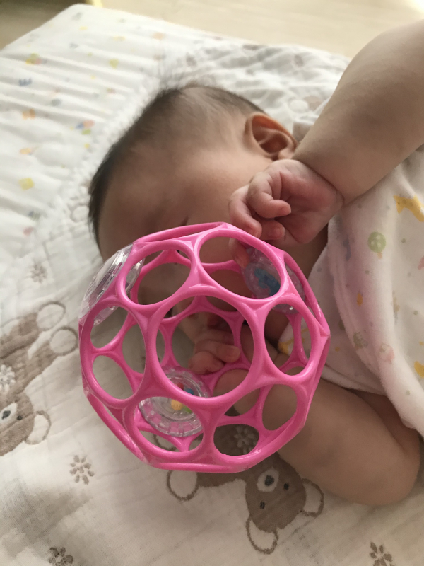 まだおもちゃを握るのが難しいのか、自分からはほとんど握りません。こちらから手におもちゃを持っていくとたまに握ったりしますが、少しすると離してしまいます。