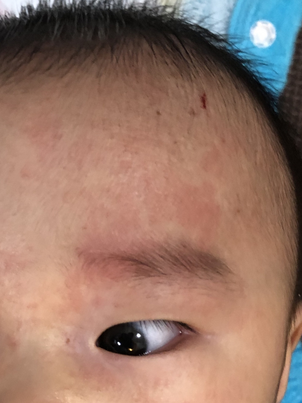 今朝起きると、左のおでこ中心に赤くなっていました。
