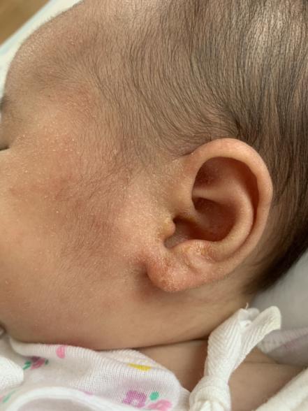 生後2ヶ月の娘がいます。最近耳の辺りの皮膚が乾燥していて皮がむけている状態で触るとガサガサ、ボコボコしており小児科でクリームをもらいました。最近ふと耳をみると黄色っぽい汁がでていました。娘の様子をみているとよく耳をかいているようで、手にも汁のようなものがついていました。これはアトピーなのでしょうか?