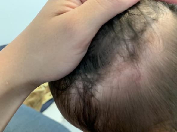 頭部の左側をぶつけ、出血やたんこぶはなく、赤くなっており一部赤黒くなっています。(内出血?)