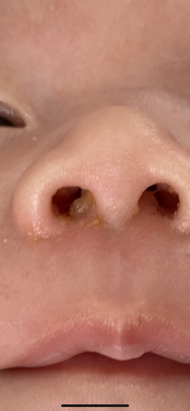 先週くらいから、鼻の穴の中に水ぶくれ?のような小さなできものがあります。11月10日に1ヶ月健診があるのでその時に聞いてみようと思っていましたが、 数が増えたというか小さいものがまとまって大きくなったような感じになっています。また昨日くらいから、膿んでいるのか黄色くなってきている部分もあり、においもあります。鼻くそもあったりして鼻の穴が苦しそうです。このできものが関係しているか分かりませんが、前より鼻が苦しそうに感じます。鼻詰まりもあるかもしれませんが…。このできものは何でしょうか?赤ちゃんにはよくあるものですか?1週間後の健診までは様子見で大丈夫てましょうか?写真を添付しています。