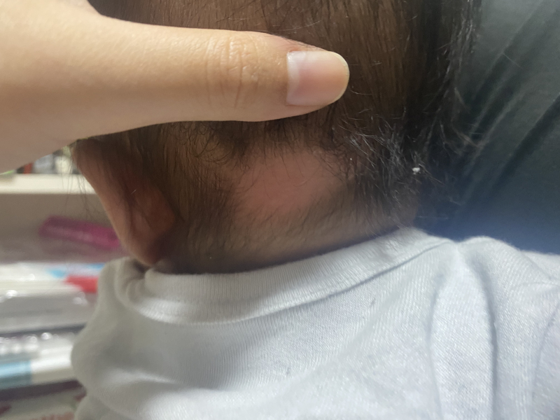 抱っこをした時ふと後頭部をみると、このように赤くなっておりこの部分だけ髪の毛が無くなっていました。