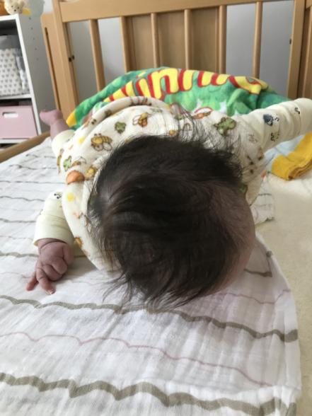 3ヶ月です。うつぶせ練習をすると、背筋のように片手や足が浮いた状態で顔を上げます。また、横を向いて終わることもあります。