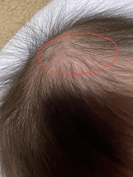 もともと髪が少ないので余計に目立つのですが、よく見るとプクッとした大きめ(8mmくらい) の発疹もあります。