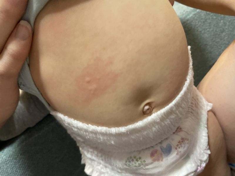 腹部も消えては来ているものの入浴中でにじんわりとした赤みの中に 水ぶくれではないですが蕁麻疹のようなプクッとした触ると白くなる発疹が2、3粒ほど出ているのに気づきました。