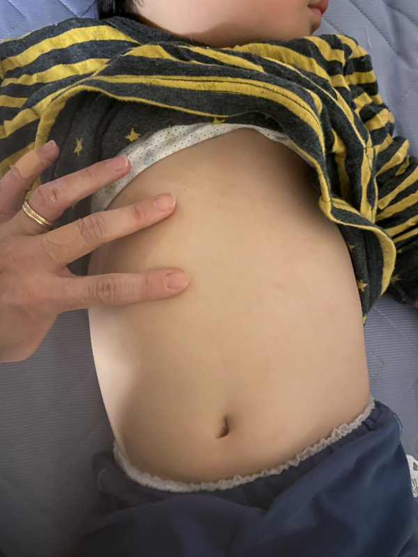 息子さんがよそ見をしていて、歩きながらソファの木の手すりの所にお腹をぶつけてしまっていたのですね。