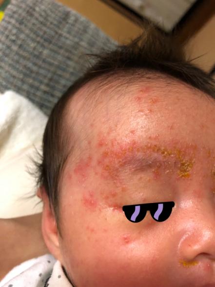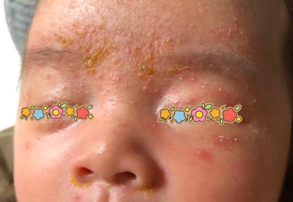これは乳児湿疹でしょうか、それともアトピーの可能性はありますか?今のところ痒そうにはしてないのがせめてもの救いです。 日に日にひどくなっているのですが、家でできるスキンケアは何がいいでしょうか。