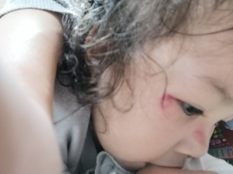 今週2歳になる娘が、家の中で走り回っていて、ベランダに向かって行って、ベランダの木の2cmぐらいの窓枠が2cmほどでっぱっていて、そこに向かって激突し、鼻の頭の上の少し左側からおそらく目の下と目尻辺りにぶつかり、号泣しました。すぐに抱き上げたらもう両方赤くなっていて、目の横の目尻のところは少し切れて血が出ています。