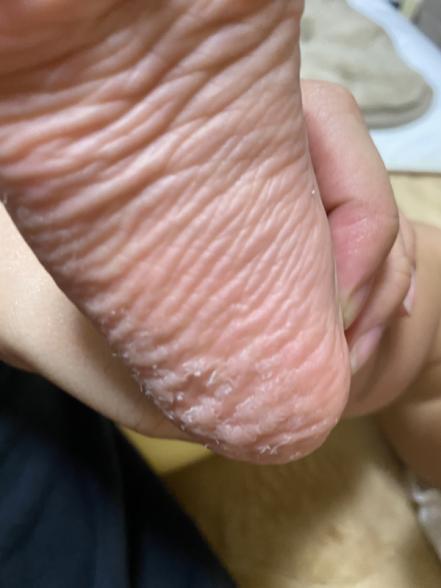 お風呂あがりに足の裏を見てみると写真のようにふやけてとても皮がむけていました。