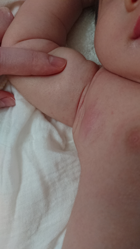 生後2ヶ月の女の子て、前日のお風呂(PM6:30ごろ)には無かったのですが、朝に授乳後 着替えさせる時に脇の下のしこりが出来てました。