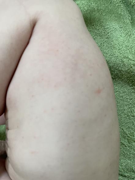 かぶれだったのかなーと思い、お風呂のために服を脱がすとお腹と脇腹らへんにこのような発疹がありました。