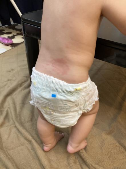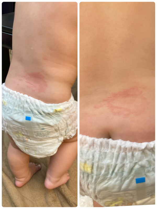 産まれた時はなかったです。夏ごろからだったので、汗疹だと思っていたのですが、その頃は親指くらいの大きさの赤みでしたが、今年にはいり、だんだん、大きさが気になってきました。昨日と今日比べた写真添付します。左が、昨日、その夜ロコイドつけてます。右が今日です。