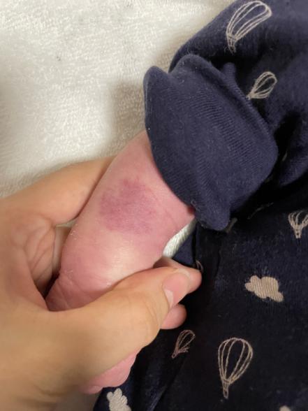 お子さんの腕にあざのようなものができているのを見つけられたのですね。