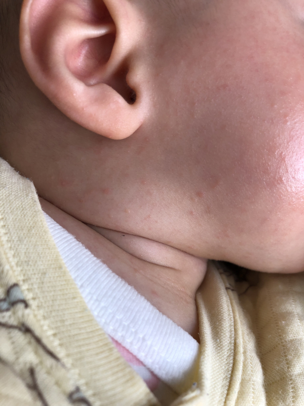 生後5ヶ月の息子なのですが、ここ数日顔や耳の後ろ、首や顎の下辺りに赤い湿疹が出ています。