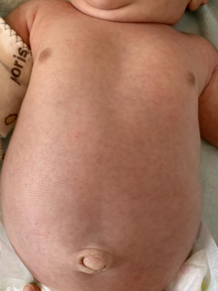 数日前に、オムツ交換の際、オムツの上やオムツが当たる部分の腹部に赤い1ミリの発疹がぱらっと出ました。だんだん、胸部にも腹部同様にぱらっと、ほっぺにも何箇所か発疹が出ました。