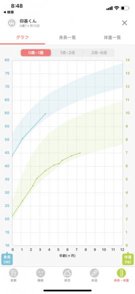 もともと眠いときなどによくぐずぐずいい、起きたら機嫌のいい息子。お腹すいたーとなくよりもそっちの方が多いです。授乳回数は6回前後と気持ち少なめです。先日の検診では特に体重のことは何も言われませんでしたが、もともと小柄なので成長曲線は下の方でゆっくりと成長しています。画像の通りです。このまま離乳食をすすめて、また授乳もこのペースでいいでしょうか。一歳になったら職場復帰〜娘の時はできなかったので〜が決まっています。
