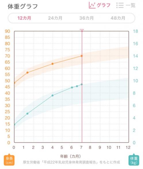 今日で7か月、女の子です。離乳食とミルクの量についてお聞きしたいです。娘は身長が約70cm、体重は9.5kgで、体重が曲線を出てしまいました。