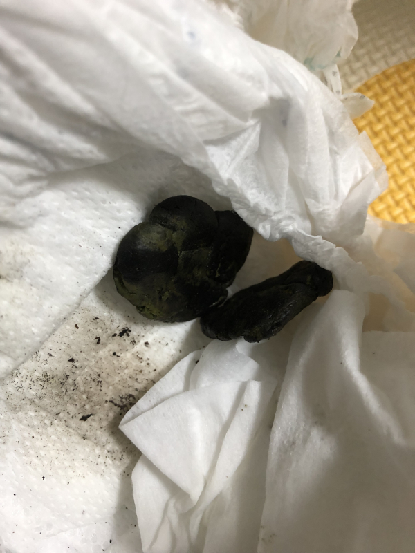 もともと小さい頃から便秘気味な事もあり最近はコロコロと固いウンチをよくしていて 色も比較的緑っぽかったんですが なんだか緑が増して黒っぽくなってきてしまい心配になってしまいました。