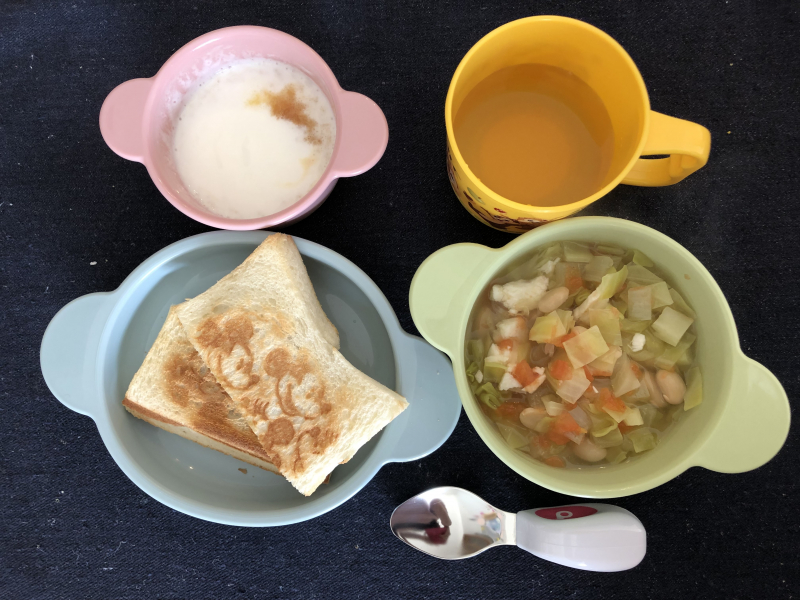 1〜2週間に1回程度、お昼寝前に昼食を食べられた時には15時ごろに間食(果物、チーズ等が多いです)を