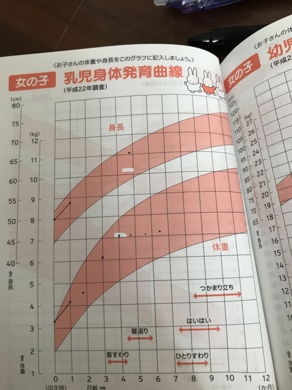 母子手帳の成長曲線を添付させていてだきました。身長は自宅で測れないため4か月検診で測ってから測れていません。よろしくお願いいたします。