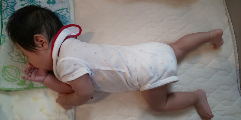 そしてうつ伏せ遊びを目の前にいる間だけする時にも、どちらかの脚をお腹に引き寄せて、ゴロンと動くのを声をかけながらするようにされるといいと思います。
