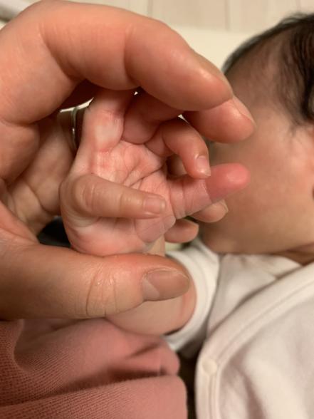 髪の毛が細いので見にくいですがてのひらにたくさん抜けた毛がついています。