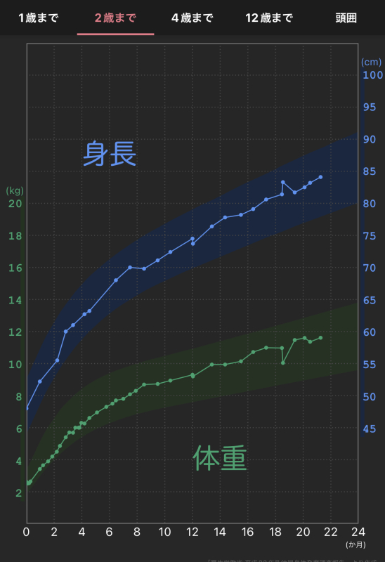 お子様の身長と体重が成長曲線のカーブに沿って伸びていれば、ちょうどよい食事量という判断ができます。お子様によって代謝スピード違いますから、食事の必要量も変わってきます。今後も、成長胸腺のカーブを参考に量を調整してあげて下さいね。