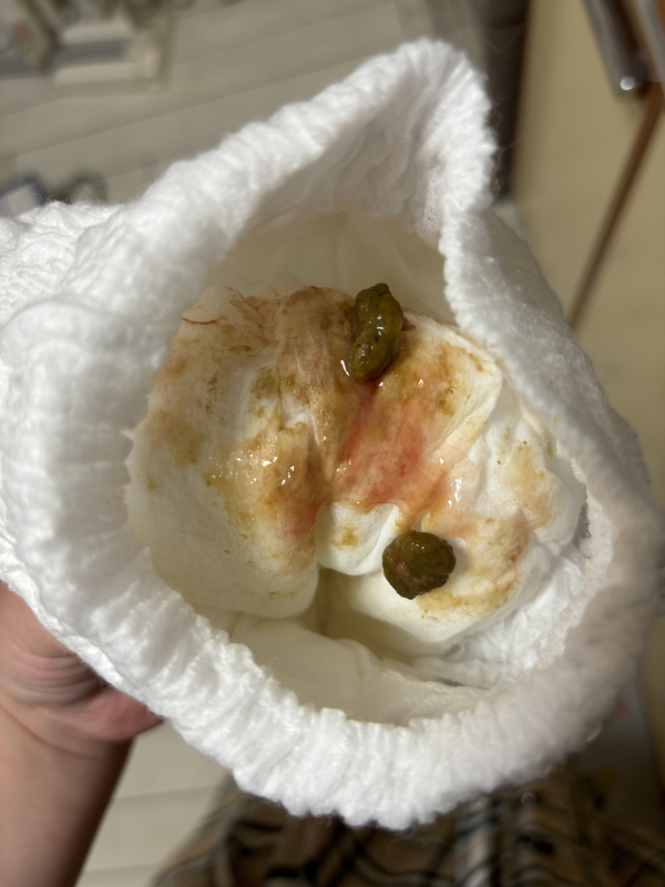 今朝排便が2回あり、1回目は硬い便で同様に赤い粘液がついておりましたが2回目からは少し柔らかめで粘液はありませんでした。