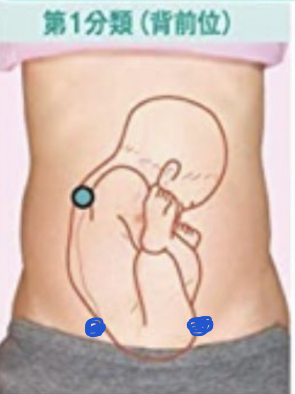 今日検診日だったのですが、診察前に自分でエンジェルサウンズで心音を聞いたところ、写真の右の青丸の位置で1番大きく心音が聞けました(臍帯音ではなくドコンドコンという音でした)